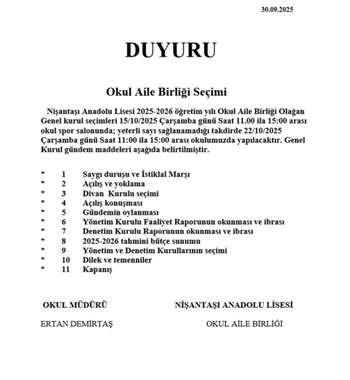 Nişantaşı Anadolu Lisesi 2025-2026 öğretim yılı Okul Aile Birliği Olağan Genel kurul seçimleri 15/10/2025 Çarşamba günü Saat 11.00 ila 15:00 arası okul spor salonunda; yeterli sayı sağlanamadığı takdirde 22/10/2025 Çarşamba günü Saat 11:00 ila 15:00 arası okulumuzda yapılacaktır.