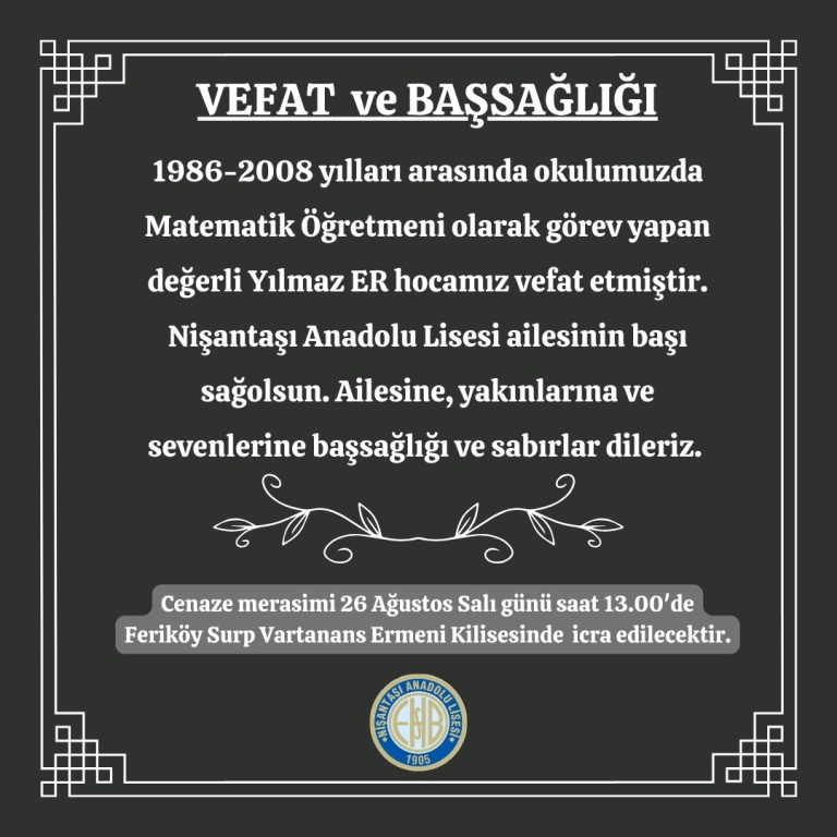 1986-2008 yılları arasında okulumuzda Matematik Öğretmeni olarak görev yapan değerli Yılmaz ER hocamız vefat etmiştir. Nişantaşı Anadolu Lisesi ailesinin başı sağolsun. Ailesine, yakınlarına ve sevenlerine başsağlığı ve sabırlar dileriz.